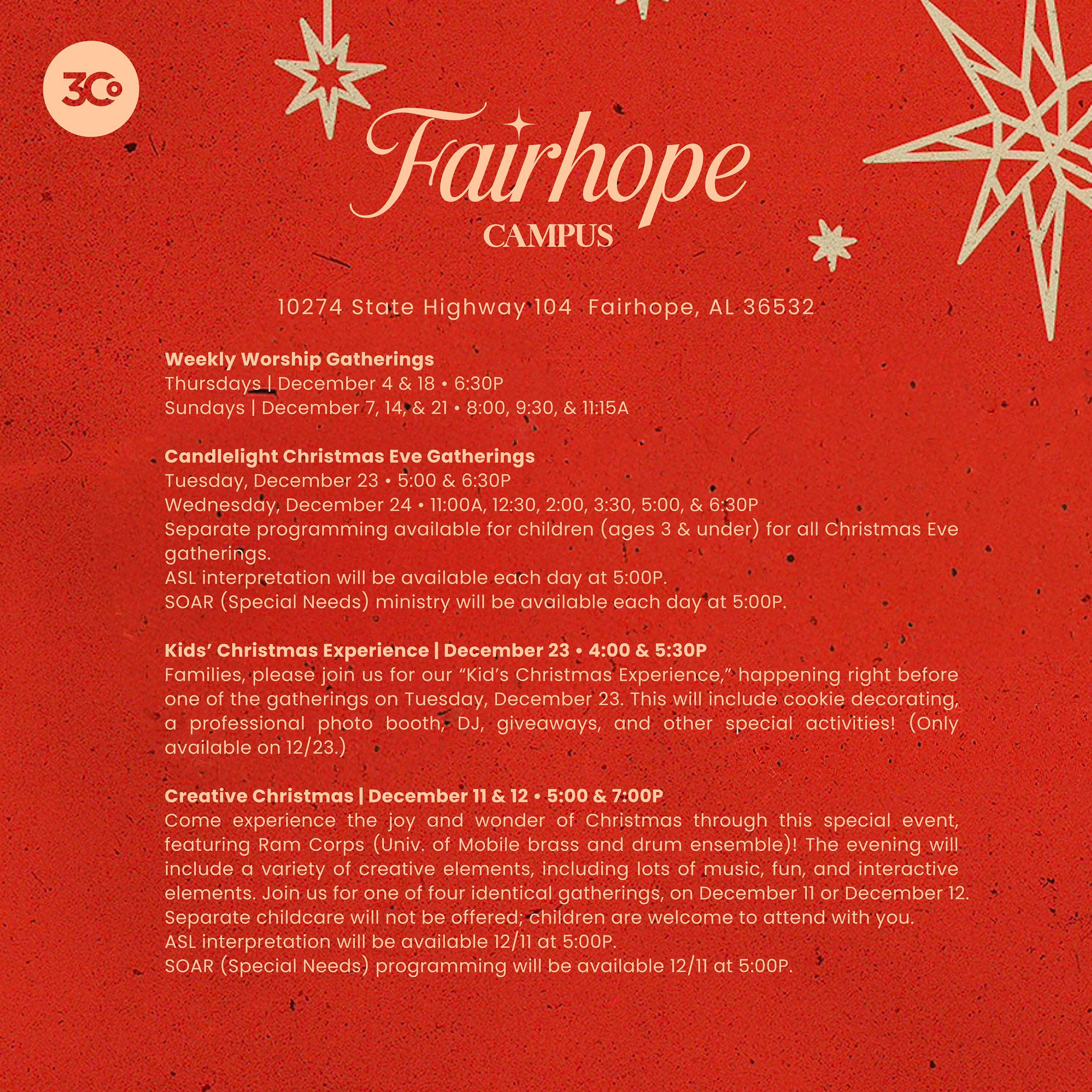 Select your campus to learn about gatherings, participate in Christmas initiatives, and invite your friends.